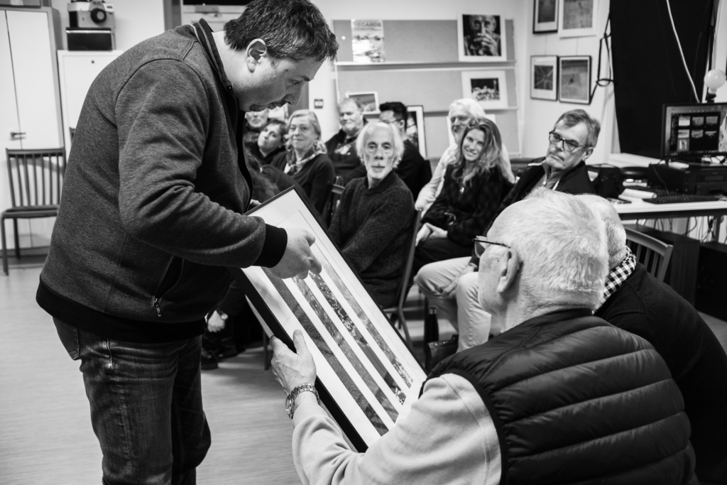 Désolé, j’avais oublié de mentionner la présentation d’un montage sous cadre fait de bandes issues de 4 tirages « ratés » si je me souviens bien. Cette présentation étant faite par Patrick Bouton.